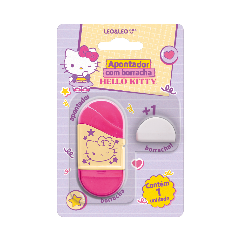 O apontador com borracha Hello Kitty tem formato de cápsula super charmoso, com o rostinho da nossa gatinha favorita estampado com estrelas e muito estilo!