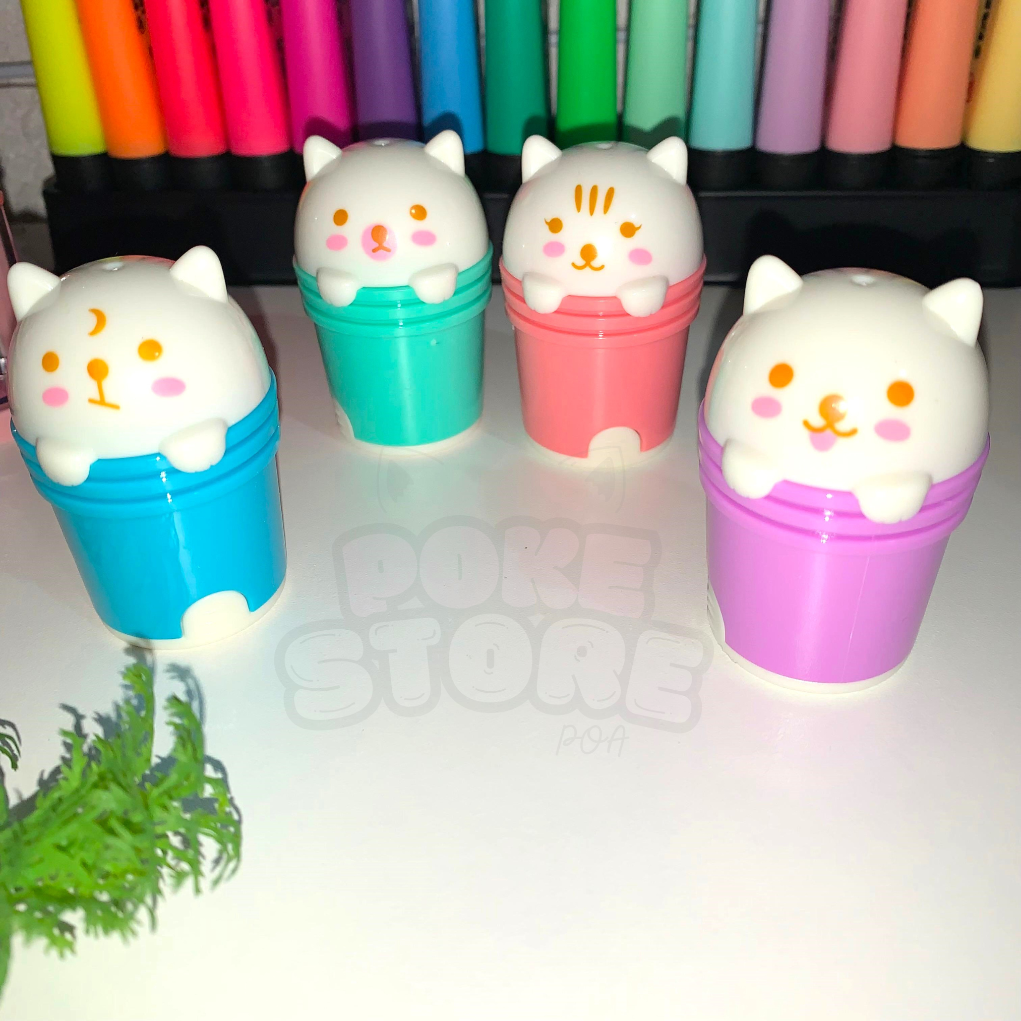 Disponível em cores sortidas (azul, verde, rosa e lilás), cada um com um gatinho diferente pra colecionar ou presentear.