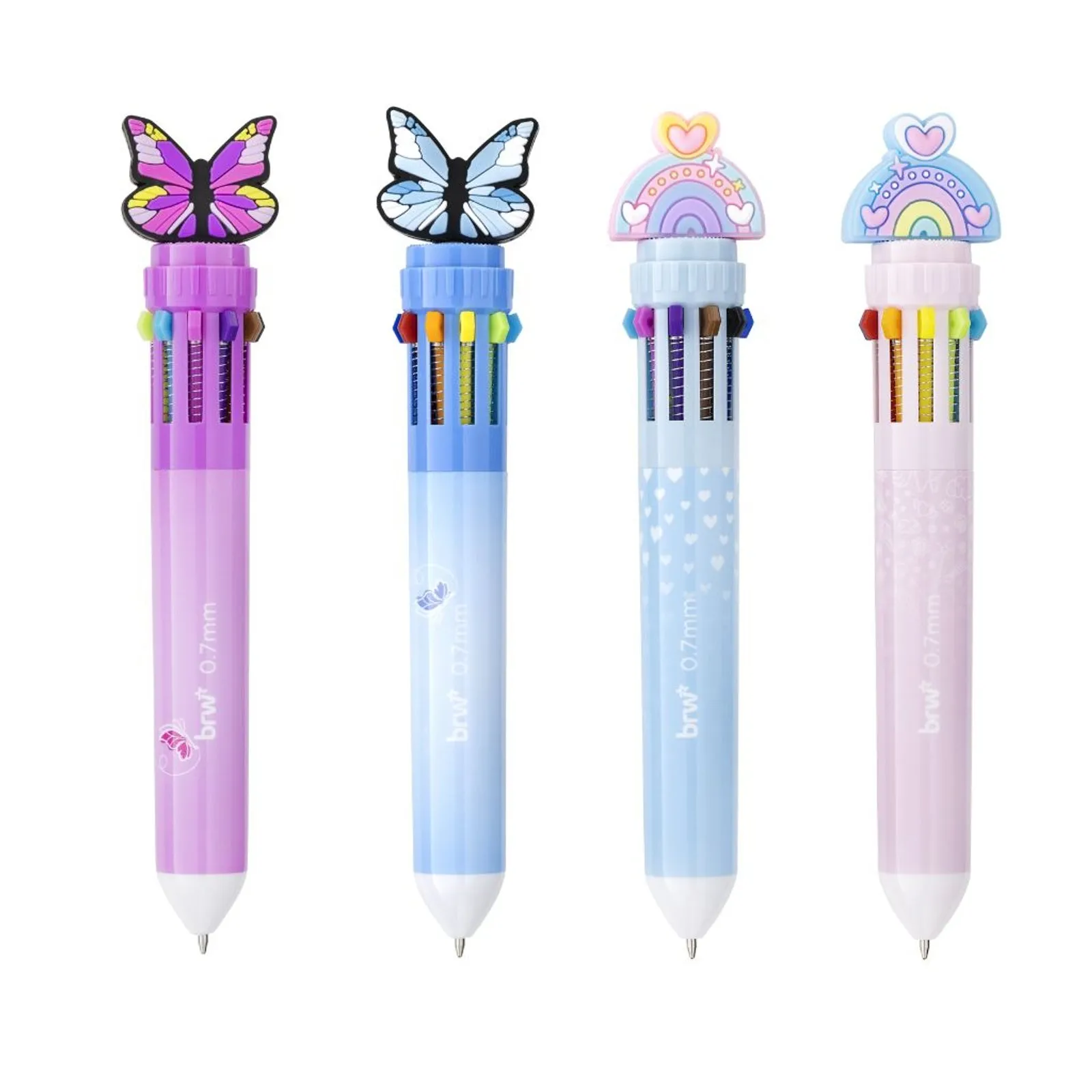 São 10 cores incríveis em uma única caneta, e o melhor: com pontas lindas de borboletas e arco-íris que dão um toque mágico a cada traço! 💖