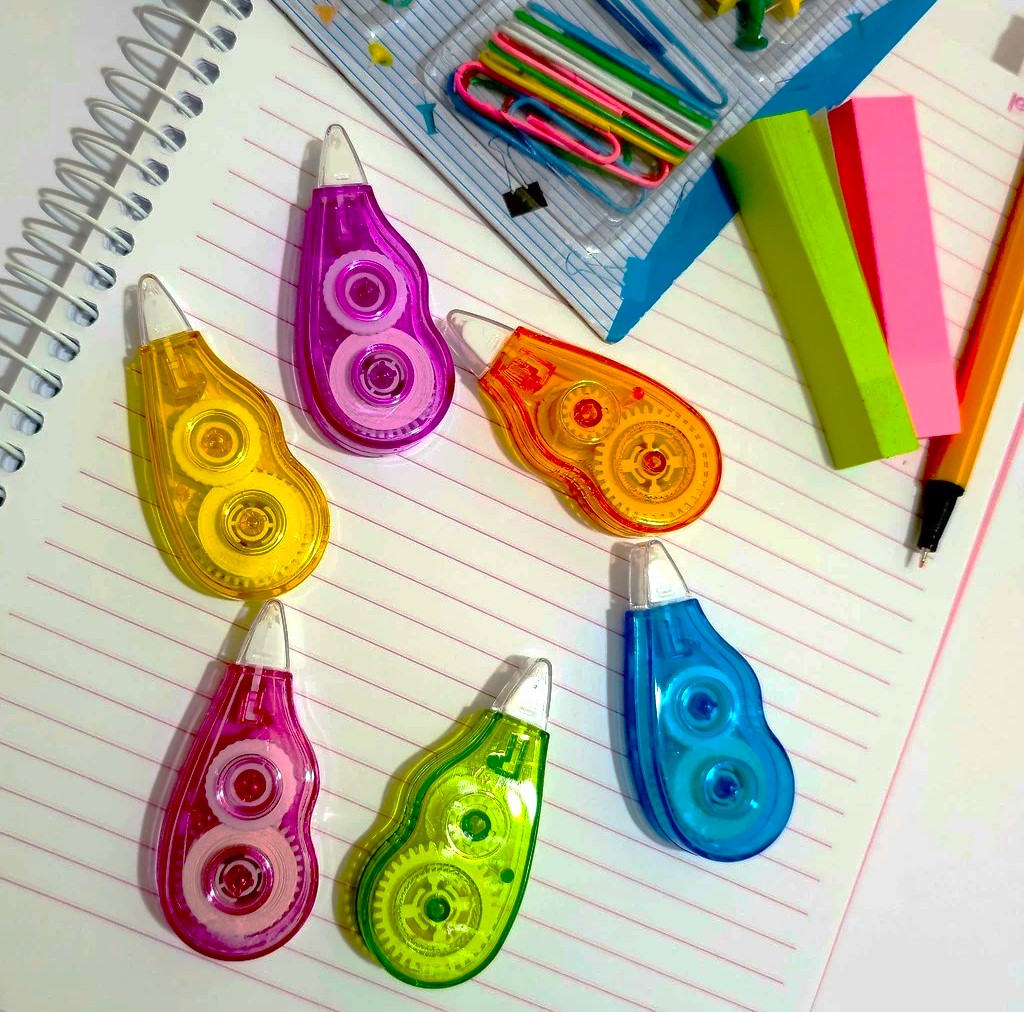Palavra-chave: fita corretiva colorida, fita corretiva transparente, fita corretiva minimalista, corretivo em fita escolar, fita corretiva moderna, papelaria colorida, fita corretiva neon