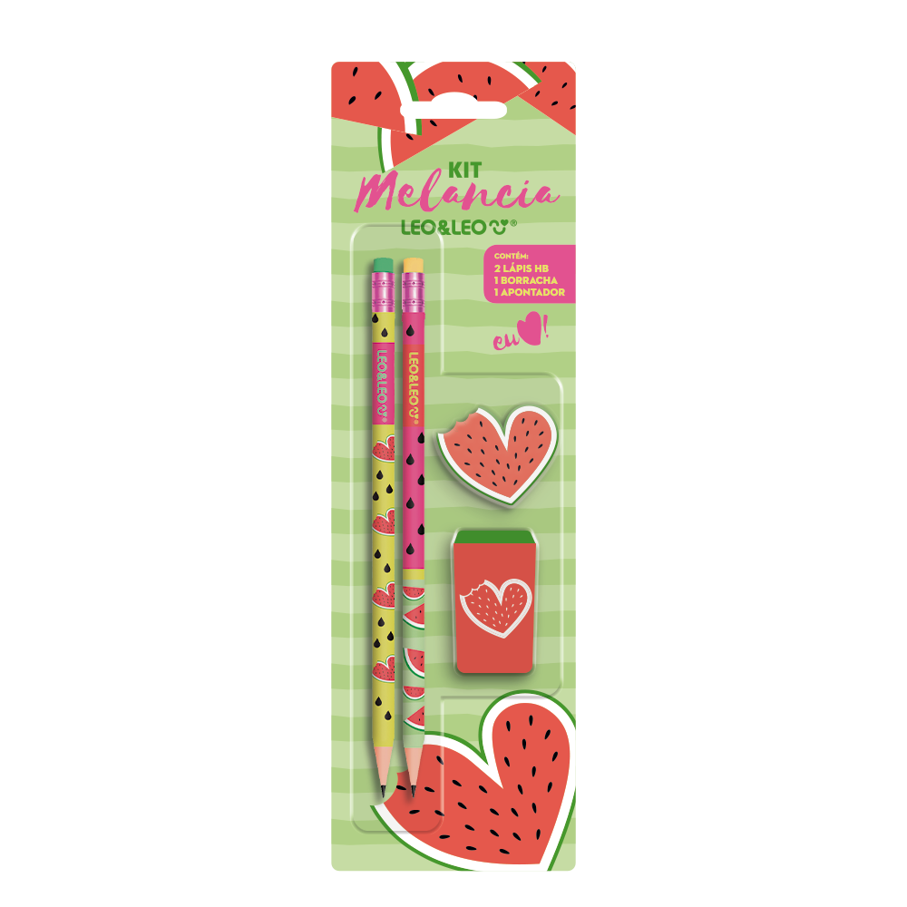 Ele vem com 2 lápis com borracha, um apontador com depósito super prático e uma borracha em formato de coração, estampada como uma melancia mordidinha – simplesmente irresistível! 😍