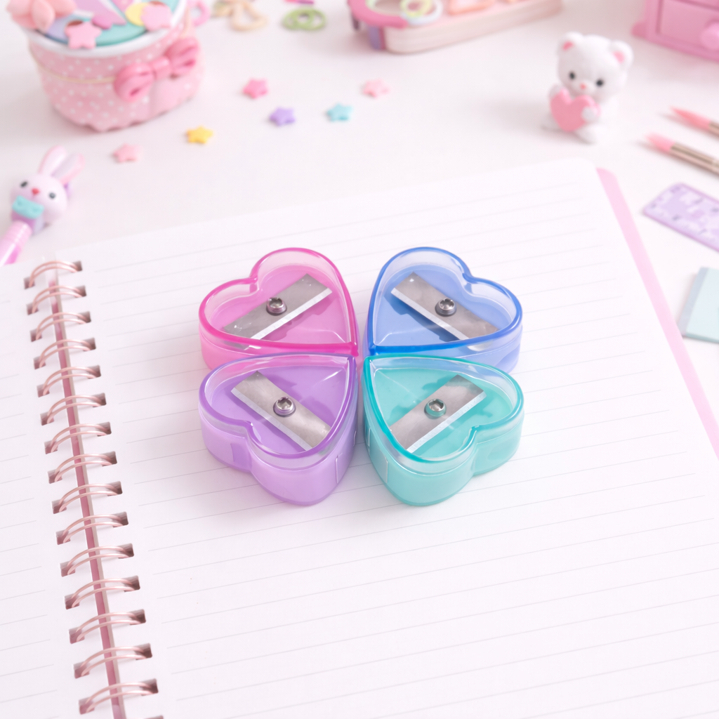mini apontador cis, apontador coração, apontador com depósito cis, apontador escolar fofo, apontador infantil, apontador colorido, papelaria fofa, papelaria criativa, apontador para kit escolar, apontador pequeno, itens de papelaria escolar