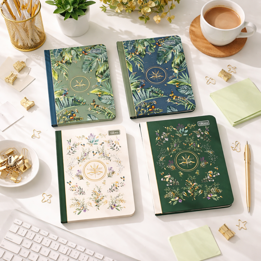 Com uma estética delicada inspirada na natureza, ela traz capas com ilustrações sofisticadas, detalhes em foil dourado e uma textura tipo linho que dá um toque super premium ao produto. 💛